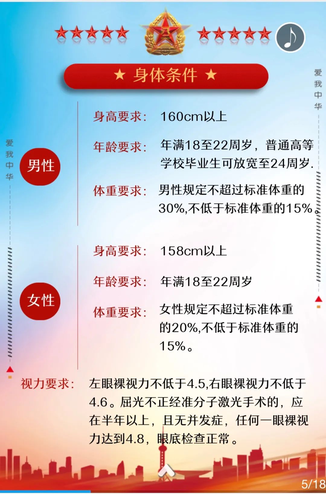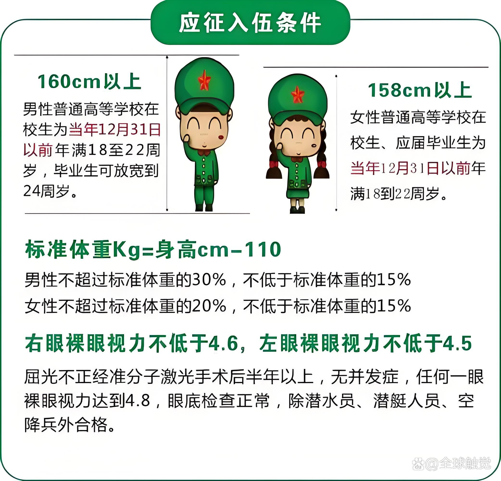 1、身高、体重:根据不同军种的需求,设定不同的身高、体重标准。