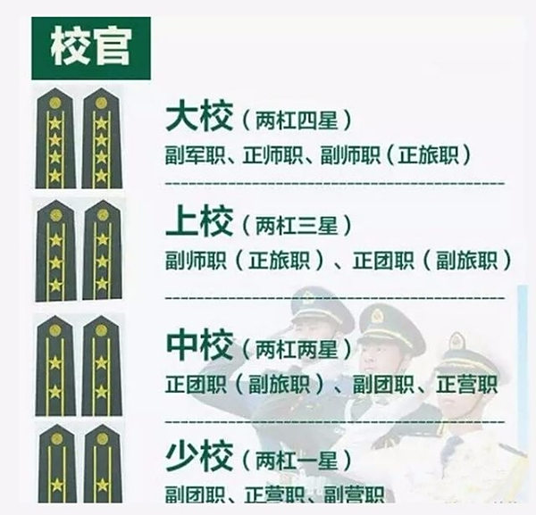 2、校官:包括少校、中校和上校三个等级,担任连长(连职)、副营长(副营职)至副师长(副师职)等职务,上校是校官的最高军衔,大校是校官中的高级级别,通常担任师长(师职)等职务。