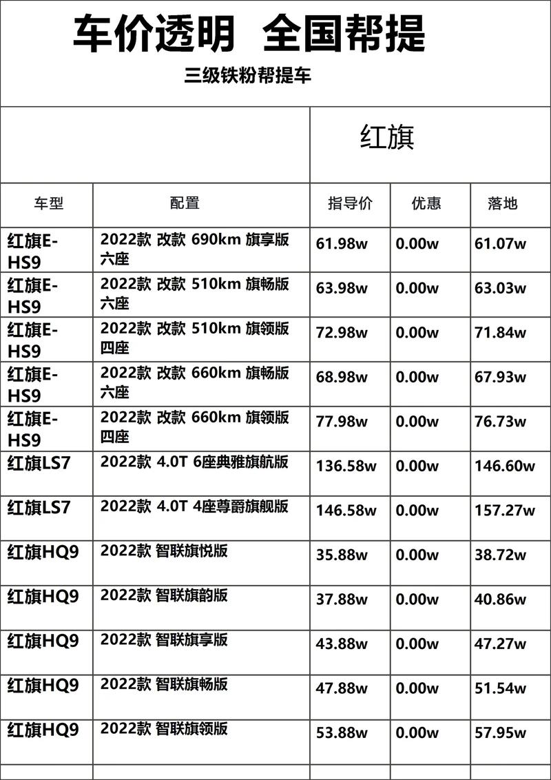 红旗车型多样,涵盖多种车型和配置,满足不同消费者的需求。其报价表详细列出了不同车型的售价,让消费者一目了然。红旗汽车以其卓越的品质和性能,赢得了广大消费者的信赖和喜爱。无论是轿车、SUV还是其他车型,红旗都致力于为消费者提供高品质的汽车产品和服务。红旗车型丰富多样,报价透明,是您选购汽车的理想之选。