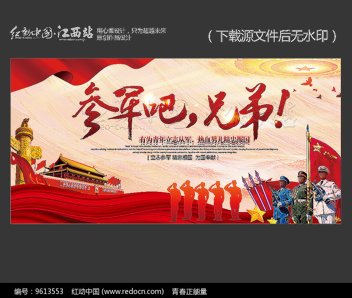 2、口号标语:口号标语是征兵宣传广告的重要组成部分,如“投身军营,报效祖国”、“青春无悔,军旅人生”等口号,简洁明了地表达了参军报国的荣誉感和使命感。
